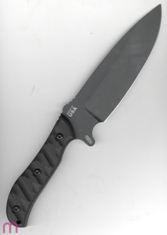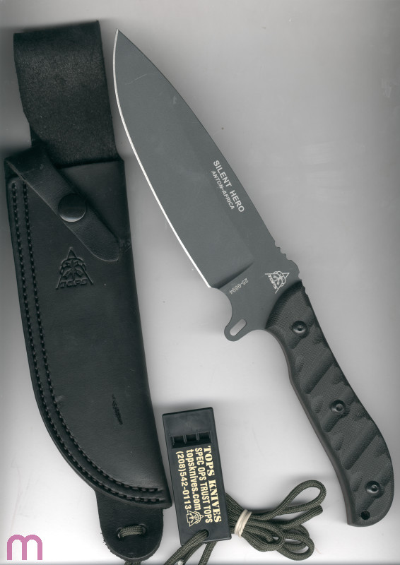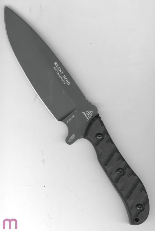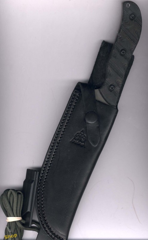 Sehr robust für ein Messer dieser Größe, Fangriemenöse am Griffende, Daumenauflage auf dem Klingenrücken, Lederscheide. Design von Anton Du Plessis.
