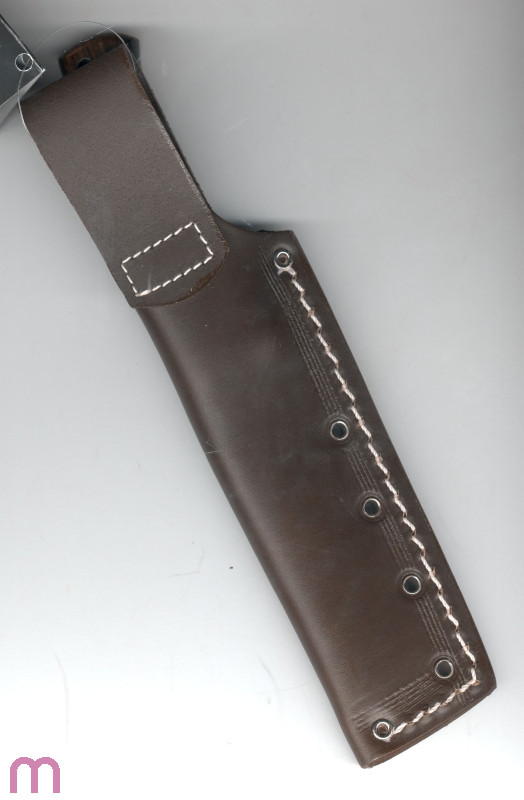 Sehr schön ausgewogenes Jagdmesser mit einer Köcher-Lederscheide. Außergewöhnlich „schmusige“ Handlage. Sicherer Sitz in der Scheide. 4 Hohlnieten in Reihe um zB. Zusatztaschen/ -Teile zu befestigen.