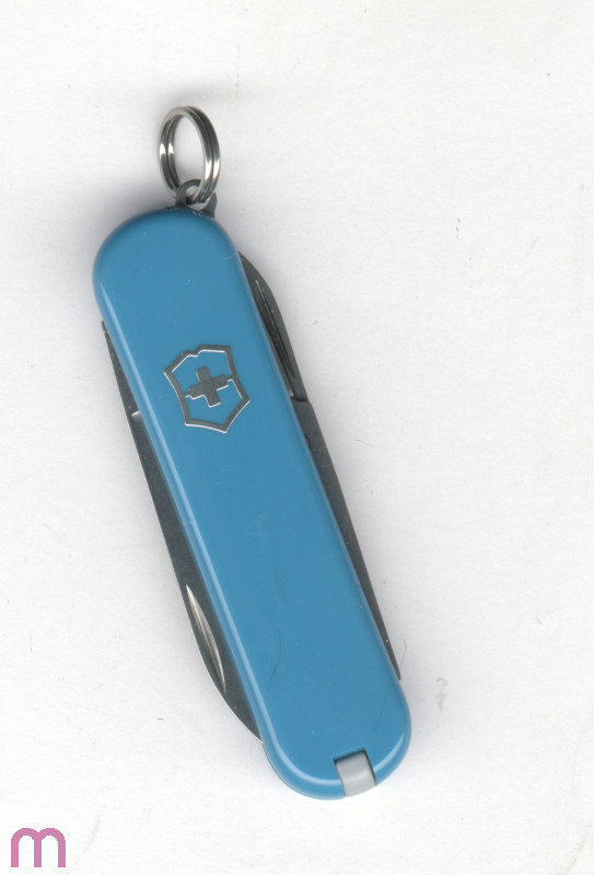 Klinge, Schere, Feile mit Flachschraubendreher, Zahnstocher, Pinzette, Ring.