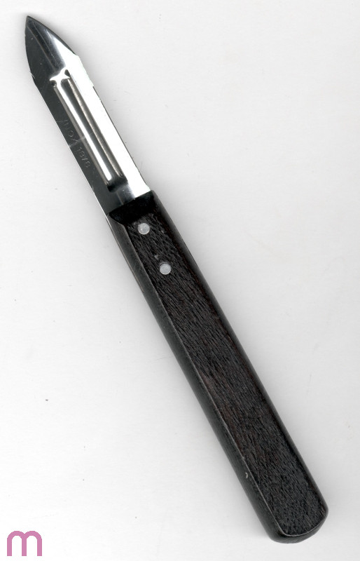 Schäler von Victorinox mit einem Holzgriffstück, starre Klinge mit scharfem Glattschliff. Gesamtlänge 15,5cm, davon ca. 5,6cm Klingenlänge, mit spitz zulaufendem Ausstecher.